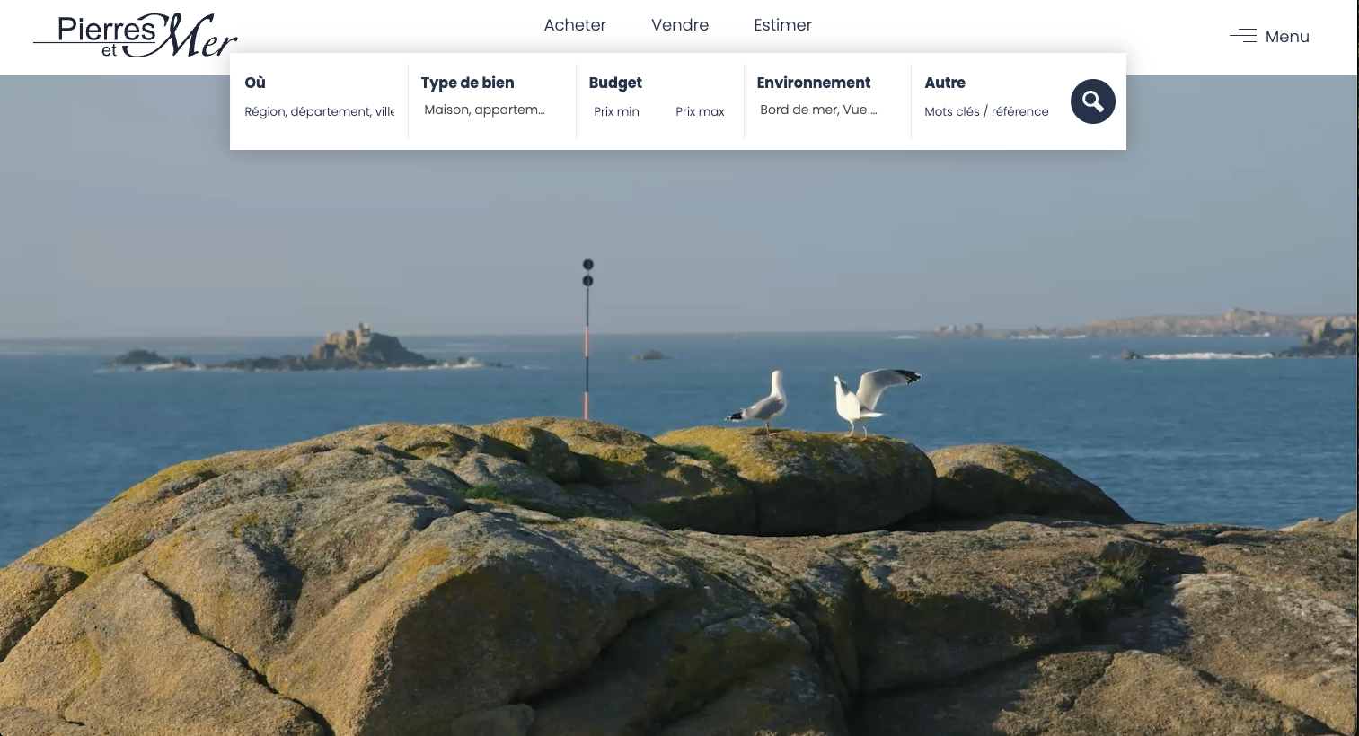 Chaque élément a été repensé pour valoriser la marque Pierres et Mer, offrir une navigation fluide et intuitive, et créer une expérience de recherche immobilière inspirante et immersive.